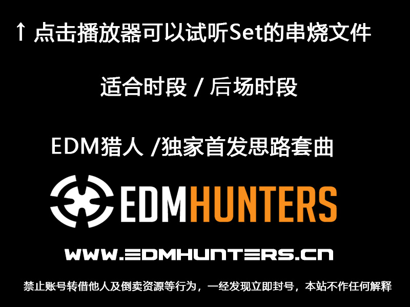 EDM猎人音乐网是国内一家专业服务于DJ的高端电子音乐网站。全站海量音乐资源,定期更新同步国内外优秀音乐资源!